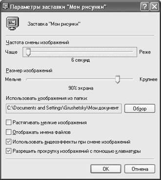 5. Нажмите кнопку Параметры (Settings). Появится диалоговое окно Параметры заставки "Мои рисунки" (My Pictures Screen Saver Options):