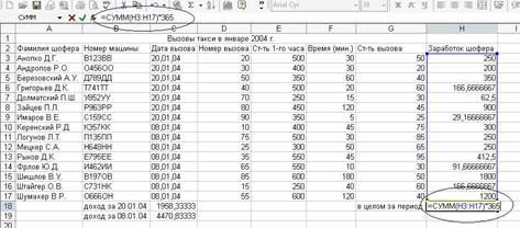 Для определения дохода таксопарка по дням нужно просуммировать заработок шофера по дням (в нашем случае нам надо посчитать доход за 20.01.04 и за 08.01.04). Существует несколько способов вычисления суммы. Первый способ с помощью кнопки на панели инструментов (автосуммирование), для этого поставим курсор на ячейку C18, и нажмем на панели инструментов кнопку автосуммы, далее выделим диапазон, по которому надо считать доход таксопарка по дням, далее нажимаем Enter (рис. 5).