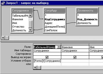 - кнопка «Найти по фамилии» предназначена для поиска сотрудника в БД по фамилии и выполняет запрос «Фамилия», который создан аналогично запросу «ТабНом». Запрос создан в режиме конструктора с помощью таблиц «Сотрудники», «СотрАдр» и «Должность» (см. рис. выше). В поле условие отбора задан параметр отбора сотрудников по фамилии из БД.