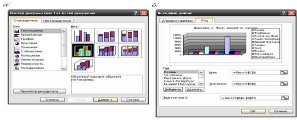Рисунок 1 – Общий вид окна «Мастер диаграмм» (а) и набранные исходные данные диаграммы 1 (б)