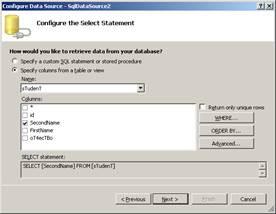В Visual Studio 2005 придусмотрен интерфейс автоматического вывода определнного столбца базы данных в такие элементы управления, к примеру, как DropDownList. На следующий рисунках изображен пример такого интерфеса: