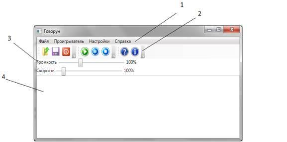 Інтерфейс користувача являє собою вікно програми зображене на малюнку 4.1. Вся робота ведеться саме в ньому. У верхній частині вікна знаходиться головне меню (1), а під ним панель інструментів (2), яка повністю дублює меню. Ще нижче знаходиться панель модифікаторів (3). Частину, що залишилася вікна займає текстове поле, для введення тексту, який буде проговорюватися (4).