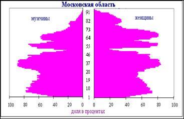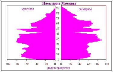 Форма половозрастной пирамиды зависит не только от колебаний рождаемости и смертности, но и от миграций населения. Москва и ее окрестности всегда были центром притяжения переселенцев со всей России.