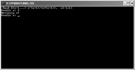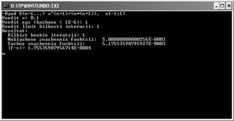 Обчислення суми членів ряду проводити доти, доки абсолютна величина члена ряду не стане меншою від (наприклад, ). При цьому порахувати кількість виконаних кроків ітерації (скільки членів ряду ввійшло в суму). Крім того, для підстраховки від зациклювання, яке може виникнути через некоректні вхідні дані, встановити ліміт кількості кроків. Якщо вихід із циклу відбувся через вичерпання ліміту, то видати про це повідомлення.