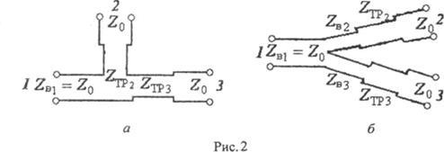 При последовательном разветвлении (рис.1а) входное сопротивление в точке соединения линий будет определяться суммой волновых сопротивлений выходных плеч делителя: