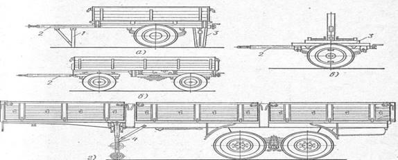 Рис. 3. Типы прицепного состава: а — одноосный прицеп; б — двухосный прицеп; в — прицеп-роспуск; г — полуприцеп