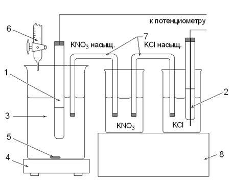 Приступая к работе, необходимо тщательно промыть электроды дистиллированной водой, убедиться в правильности сборки электрохими-ческой цепи, а также в том, что электроды надежно закреплены и погружены в растворы, отрегулировать скорость вращения мешалки, чтобы исключить разбрызгивание раствора.
