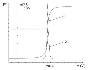 Титрование считают законченным, когда после достижения максимальных значений ΔрН или ΔЕ прибавлено еще не менее трех порций рабочего раствора. По данным титрования строят на миллиметровой бумаге две кривые: в координатах "рН − V" или "Е − V" − интегральную кривую; в координатах " ΔрН/ΔV − V'