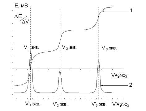), то на дифференциальной кривой будут наблюдаться несколько максимумов, каждому из которых будет соответствовать свой эквивалентный объем (рис.4). В этом случае предполагается, что титрование каждого последующего иона происходит лишь после полного осаждения предыдущего иона.