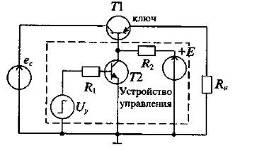 Ключи на биполярных транзисторах более совершенны, чем диодные и значительно чаще используются в электронных схемах. Простейший ключ на одном биполярном транзисторе изображен на рисунке 5. он состоит из ключевого транзистора Т1 и схемы управления на транзисторе Т2. По структуре транзисторный ключ похож на двухдиодный ключ, изображенный на рисунке 4а. При отсутствии тока базы Т1 закрыт и ключ разомкнут, а при протекании через базу тока управления iб>iб.нас ключ разомкнут. В этом случае коллекторный и эмиттерный переходы открыты и действуют так же, как открытые диоды (рис 4а).