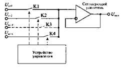 Многоканальные коммутаторы или мультиплексоры представляют собой интегральные микросхемы, имеющие много выходов для аналоговых сигналов и один выход, на который можно подать последовательно во времени любой из входных сигналов. Мультиплексоры состоят из набора ключей, устройства управления этими ключами и выходного согласующего каскада. Упрощенная схема мультиплексора изображена на рисунке 8. Такие мультиплексоры выпускаются в виде самостоятельных микросхем или входят в состав более крупных микросхем, называемых системами сбора данных. Кроме мультиплексора в систему сбора данных входят устройства, обеспечивающие обработку поступающей информации.