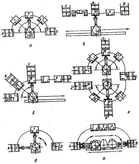 Варианты компоновки РТСК. На рис.2, а оборудование расставлено по дуге окружности, и для его обслуживания плечо робота 4 осуществляет возвратно-поступательные и вращательные движения. При переукладке деталей (узлов) с подводящего конвейера (позиция А) на конвейер (позиция D) стационарный робот 4 на фиксированных позициях 1, 2, 3 осуществляет сопутствующие, вспомогательные или контрольные операции: лужение, мойку, травление, гибку, рихтовку, контроль параметров и др. Компоновка комплекса по схеме рис.2, б предусматривает расположение оборудования в линию, и робот 4 снабжен модулем глобального перемещения между транспортными конвейерами А, В и D. Такая компоновка оборудования предполагает автоматизацию основных (5,6) и вспомогательных (1, 2,3) операций, которые обслуживает робот.