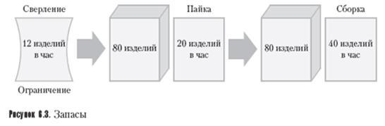 При наличии сформированного запаса участок сборки может работать с максимальной производительностью в течение трех часов, а участок пайки - в течение четырех часов. Через три часа участок сборки уже не сможет работать с максимальной производительностью, весь запас будет израсходован, и мы останемся с тем количеством, которое поступает с участка пайки, а это 20 изделий в час. После трех часов работы участок пайки все еще работает с максимальной производительностью, а участок сборки - с производительностью 20 единиц в час, несмотря на то что может обрабатывать 40. А что произойдет через четыре часа работы? На участке пайки закончится запас изделий, и работа его снова будет ограничена тем количеством, которое поступает с участка сверления (12 изделий в час). Итак, через четыре часа работы возвращаемся к производительности в 12 изделий в час, что является пределом по ограничивающему ресурсу. Как получились запасы? Чтобы их создать, на некоторое время нужно замедлить или прекратить работу оборудования. Если оборудование простаивает, то продукция не выпускается. Поскольку некоторое время выхода продукции нет, а затем в течение нескольких часов работа идет с повышенной производительностью, то средняя производительность составит все те же 12 или менее изделий в час. Если ограничивающий ресурс работает постоянно, а другие ресурсы функционируют без длительных перерывов, система дает 12 единиц в час. В случае простоя ограничивающего ресурса или его работы с меньшей производительностью снижается производительность всей системы.