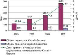 Создание трансконтинентальных магистралей выгодно для международной торговли. Между странами Европейского Союза и Азиатско-Тихоокеанского региона ежегодно курсирует около 6 млн. контейнеров. Сейчас основная часть этого потока (98%) перевозится иностранным морским флотом через зарубежные порты, минуя территорию Казахстана. Вместе с тем транзитный путь из Азиатско-Тихоокеанского региона в Европу по территории Казахстана намного короче морского пути. Главное конкурентное преимущество Казахстана – более короткое, при прочих равных условиях, время доставки грузов. Это обстоятельство позволяет прогнозировать неизбежный рост грузопотоков по направлению Китай – Европа и транзита через Казахстан (рис. 7).