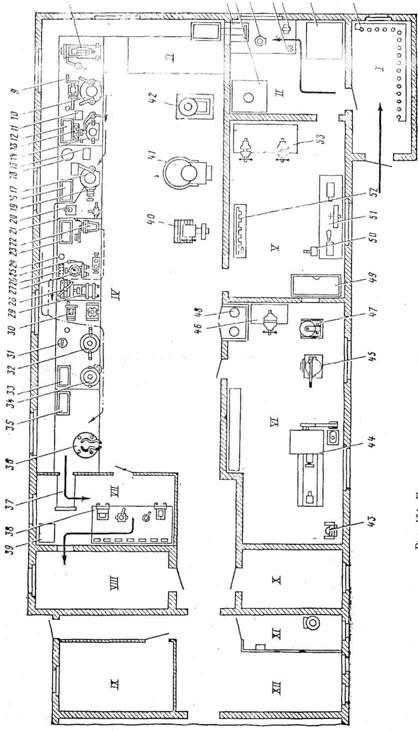 — отделение для контроля и испытания приборов; VIII