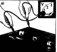 Вызывает окисление выводов, наконечников проводов и разряд аккумуляторов. Пыль и грязь на крышках и мастике пропитывается электролитом, который замыкает выводы аккумуляторов, и батарея разряжается. Для определения утечки тока по мастике нужно подключить к поверхности мастики (или крышек) вольтметр (лучше милливольтметр) (рис. 1, а). Если вольтметр (или милливольтметр) регистрирует напряжение, то необходимо очистить поверхность батареи от пыли, грязи и электролита (рис. 1, б). Электролит на поверхности крышек нейтрализуют 10%-ным водным раствором нашатырного спирта или соды с последующей протиркой крышек.