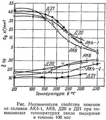 Сплавы применяют для изготовления изделий, длительно работающих при повышенных температурах, например деталей двигателей, а также для силовых элементов различных конструкций. Сплав Д20 применяют также для изготовления сварных изделий, емкостей, баллонов и других, работающих при комнатной температуре или кратковременно при повышенных температурах. Сплав Д20 сваривается, и по длительной прочности при 250—350° превосходит сплавы Д16 и ВД17, однако он менее прочен при 20°. Из него изготовляют диски и лопатки компрессоров, а также сварные детали и емкости, работающие при температурах до 350°. Сплав Д21 используется в условиях нагрева до температуры 250°; он имеет по сравнению со сплавом ВД17 более высокий предел текучести при комнатной температуре и особенно рекомендуется для длительной работы при 150°. Сравнительные преимущества отдельных сплавов видны из рис.(Б.К.Вульф, К.П.Ромадин "АВИАЦИОННОЕ МАТЕРИАЛОВЕДЕНИЕ", «МАШИНОСТРОЕНИЕ», Москва-1967), где показано изменение их свойств при различных температурах после выдержки в течение 100 час.