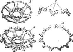 вкладають у шаблон і замість видалених зубів автоматичним наплавлюванням під шаром флюсу АН-348А по точно такому самому копіру приварюють сектори 2,