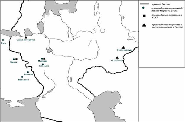 Рис.4. Картосхема «Основные центры производства трамваев»