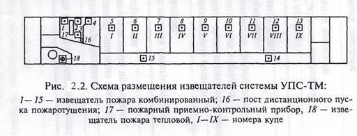 УПС-Т и УПС-ТМ взаимозаменяемы. Работа УПС-ТМ заключается в определении пожарными извещателями, расположенными в помещениях вагона (рис. 2.2), наличия и концентрации в окружающей среде продуктов горения, задымленности, скорости повышения температуры, максимальной температуры. Когда концентрация продуктов горения превышает пороговые уровни, электрические сигналы передаются на ППКП, установленный в служебном отделении, и при необходимости включается автоматизированная система пожаротушения пульта управления (АСПТ ПУ) электрооборудованием вагона.