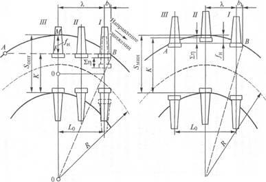 (см. рис. 3 справа), за расчетную принимается схемазаклиненного вписывания экипажа, при которой наружные колеса крайних осей жесткой базы ребордами упираетсяв наружный рельс кривой, а внутренние колеса средней оси — в рельс внутренней нити.