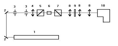 нм), частоти ГВГ, що генерується подвоювачем, яке відділяється від випромінювання основної гармоніки за допомогою дзеркала з селективним по частоті коефіцієнтом віддзеркалення. Завдяки використанню джерел ближнього ГИК діапазону для збудження поляритонної хвилі, паразитні засвічення, викликані люмінесценцією досліджуваного середовища під дією їх випромінювання, потрапляють в ГИК діапазон, далекий від області реєстрації сигналу, лежачої у видимій частині спектру. Необхідна поляризація променів, падаючих на кристал, визначається поляризаційними призмами Глана-Томсона Пг1 і Пг2. Кути падіння променів накачування на досліджуваний кристал задаються системою дзеркал З2-з4. Крім того, введення в промені накачувань додаткових фокусуючих лінз Л1-л3 дозволяє варіювати значення щільності потужності накачувань в області їх взаємодії і їх кутову расходимість. Розсіяне випромінювання збирається трьохлінзовою системою ЛС в площині вхідної щілини спектрографа СП, пройшовши заздалегідь через поляризаційну призму Глана-Томсона Пг3, службовку аналізатором розсіяного випромінювання і що відсікає що пройшло через зразок Об випромінювання пробної хвилі.