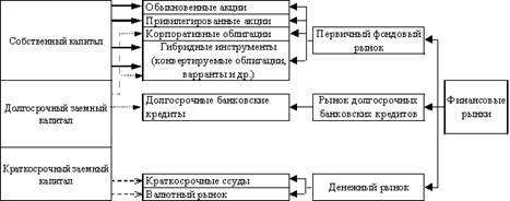 Типичное предприятие реального сектора как правило выступает в роли покупателя на финансовом рынке. Схема на рис.2 показывает связь между предприятием и рынком, а также основные финансовые инструменты, эмитируя которые предприятие сможет приобретать на рынке необходимый капитал. [8, с.42]