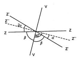Предварительно плоскость лимба приводят в горизонтальное положение по невыверенному уровню, для чего поворотом алидады устанавливают цилиндрический уровень параллельно линии, соединяющей два подъемных винта, и, вращая их в противоположные стороны, приводят пузырек уровня в нуль-пункт. Затем алидаду поворачивают на 90° и вращением третьего винта приводят пузырек уровня в нуль-пункт. При этом ось цилиндрического уровня занимает горизонтальное положение zz, образуя с осью вращения w прибора угол β (рис. 1). К отсчету по горизонтальному кругу прибавляют 180° и полученное значение поворотом алидады устанавливают на горизонтальном круге, т. Е. поворачивают алидаду на 180°. При этом ось цилиндрического уровня, сохраняя с осью вращения угол β, занимает положение z'z' и от горизонтального положения на угол 2α.