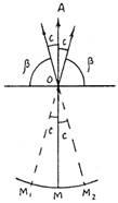 При взаимно-перпендикулярном положении осей при трубы ось образует плоскость, которую называют коллимационной. Если угол β между этими осями отличается от 90° на угол с, называемый коллимационной ошибкой, то при вращении трубы ось zz образует две конические поверхности, и при наведении на точку А вместо отсчета М (рис. 2) получим отсчет