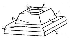 Рис. 4 - Схема ориентирных и установочных рисок на фундаменте и опорных башмаках колонны: 1 - ориентирные риски фундаментного блока; 2 - установочная риска; 3 - ориентирные риски опорного башмака; 4 - отверстие для установки колонны; 5 - опорный башмак (стакан); 6 - фундамент