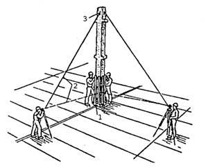 С помощью деревянных клиньев или специальной оснастки колонну перемещают до совпадения установочных рисок на ней с ориентирными рисками на стакане. При высоком положении риски на колонне ее проектируют нитяным отвесом. С помощью расчалок колонну устанавливают в вертикальное положение, контроль вертикальности осуществляют двумя теодолитами, уставленными так, чтобы их коллимационные плоскости пересекались на колонне примерно под углом 90° (рис. 5).