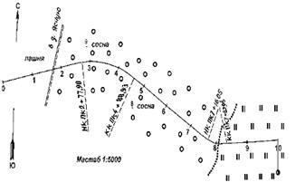 При полевом трассировании разбивают пикетаж трассы. Начальная точка трассы служит нулевым пикетом. Ее фиксируют, как все пикеты и плюсовые точки. С помощью кола диаметром 30мм, длиной 150мм, которые забивают почти вровень с землей. Рядом с колом на расстоянии 200 мм по направления хода забивают сторожок – кол длинной 300….500 мм. На сторожке пишут номер пикета, так чтобы надпись была обращена назад по ходу к точке пикета. Пикет окапывают канавкой.