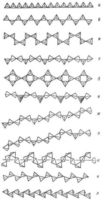 Рис. 4. Важнейшие типы кремнекислородных цепочечных анионных группировок (по Белову): а-метагерманатная, б – пироксеновая, в-батиситовая, г-вол-ластонитовая, д-власовитовая, е-мелилитовая, ж-родонитовая, з-пирокс-мангитовая, и-метафосфатная, к-фторобериллатная, л – барилитовая.