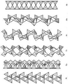 Рис. 7. Важнейшие типы ленточных кремнекислородных группировок (по Белову): а – силлиманитовая, амфиболовая-см. рис. 5, а, ксонотлитовая-см. рис. 6, а; б-эпидидимитовая; в-ортоклазовая; г-нарсарсукитовая; д-фенаки-товая призматическая; е-эвклазовая инкрустированная.