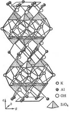 , иллюстрирующий переслаивание алюмокремне-кислородных сеток с полиэдрич. слоями крупных катионов Аl и К.
