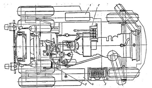 1 - масляный бак; 2 — гидрораспределитель; 3 —аккумуляторная батарея ; 4 — топливный бак; 5 - педаль выключения сцепления