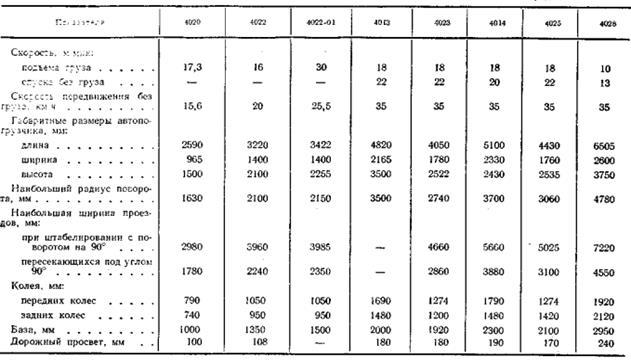 Автопогрузчики в основном предназначены для выполнения подъемно-транспортных работ с тарно-штучными грузами: при загрузке и разгрузке грузовых автомобилей, железнодорожных платформ, морских судов (работа в трюмах), самолетов; при работе на грузовых дворах железнодорожных станций,: а также на территории морских и речных портов, в открытых/а с применением нейтрализаторов для отработавших газов, устанавливаемых в глушителе, и закрытых складах, а также цехах заводов и фабрик. Кроме того, их используют на монтаже промышленного оборудования и для выполнения вспомогательных работ в строительстве, а в некоторых случаях для погрузки насыпных грузов при работе с ковшом. Дальность транспортирования грузов может доходить до 500 м, а иногда и больше, если это целесообразно. Они могут работать на горизонтальных площадках (с уклоном не более 2°) с твердым дорожным покрытием (асфальтобетонное, цементобетонное и булыжное), а также с естественным уплотненным покрытием (при хорошем отводе поверхностных сточных вод) и температуре окружающего воздуха 40°С. В пределах рабочей площадки, а также на расстоянии транспортирования груза по условиям безопасности скорость движения с грузом может доходить до 10 км/ч, а при перегонах без груза — до 30—35 км/ч. Возможный преодолеваемый ими уклон не менее 8° на длине до 40 м.