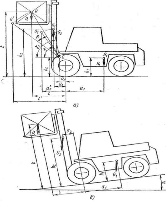 автопогрузчика рассчитывают при штабелировании. Автопогрузчик с поднятым номинальным грузом на полную высоту и отклоненным назад грузоподъемником на угол β=β1