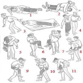 Переноска и перекладывание тяжело пострадавших с множественными переломами производится втроем или вчетвером. В первом случае первый носильщик поддерживает голову и верхнюю часть туловища, второй - таз, а третий - ноги. Для переноски вчетвером носильщики становятся с двух сторон от пострадавшего.
