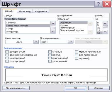Диалог состоит из трех вкладок. Первая из них, называющаяся Шрифт (см. прилож.5; рис. 2), фактически дублирует кнопки панели инструментов.