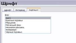 Вкладка Анимация (см . прилож.6;рис.2) предназначена для задания интерактивных эффектов в оформлении. Такие эффекты по большей части применяются в документах, подготавливаемых для публикации в Интернет, но даже в этом случае их лучше не использовать.