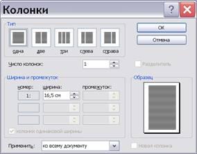 Рисунок 1 В окне «Колонки» устанавливается число колонок, задаётся их тип,