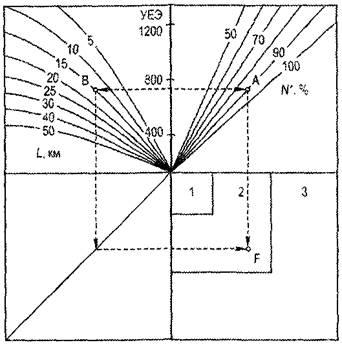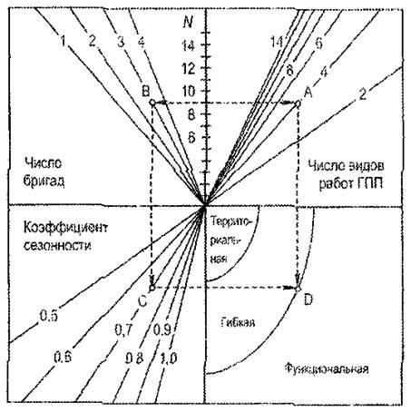 Например, в период подготовки ферм к зимовке скота ЭТС имеет функциональную структуру, а в период зимовки территориальную структуру. Возможны и другие перестройки службы в зависимости от годовой программы и графика ТР. Обоснование структуры ЭТС выполняется графическим методом по номограмме, приведенной на рис. 4 [5].