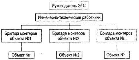 Территориальная структура ЭТС приведена на рис.3. В ее основе лежит распределение исполнителей по объемам хозяйства (отделениям, бригадам, фермам). При этом выделенные группы исполнителей осуществляют все эксплуатационные работы, но только на своих участках.