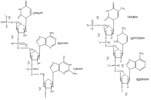 Ниже изображены короткие структурные фрагменты цепей РНК и ДНК, позволяющие представить соединение отдельных нуклеотидов в цепи.