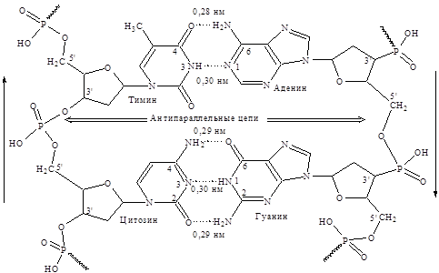 Тимин связан тремя водородными связями с аденином ТºА, цитозин двумя водородными связями с гуанином G= С. Эти пары оснований называются комплементарными парами оснований. Благодаря этому нуклеотидная последовательность одной цепи полностью комплементарна последовательности другой.