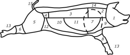 1 – голова з щековиною; 2 – шийна частина; 3 – спинна частина (корейка); 4 – пiдстегенце; 5 – тазостегновома частина (окорок); 6 і 8 – задня і передня голяшки; 7 – лопаткова частина; 9 – нижня шийна частина; 10 – бічна частина без ребер; 11 – ребра; 12 – пашина; 13 – ноги; 14 – шар сала, що йде на посол; 15 – хвіст