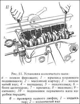 В нижней части блока цилиндров имеется пять опор коренных подшипников со съемными крышками, которые крепятся к блоку специальными болтами. Крышки невзаимозаменяемы (отверстия под подшипники обрабатываются в сборе с крышками) и маркированы для отличия рисками на наружной поверхности В средней опоре имеются гнезда для упорных полуколец 12, препятствующих осевому перемещению коленчатого вала. Спереди (со стороны шкива коленчатого вала) ставится сталеалюминевое полукольцо, сзади - металлокерамическое. Кольца изготовляются с номинальной и увеличенной на 0,127 мм толщиной. При превышении осевого зазора коленчатого вала 0,35 мм меняются одно или оба полукольца (номинальный зазор - 0,06-0,26 мм).