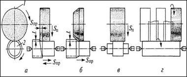 а — шлифование с продольными рабочими ходами: 1 — шлифовальный круг; 2 — шлифуемая заготовка; б — глубинное шлифование; в — врезное шлифование; г — комбинированное шлифование; Snp