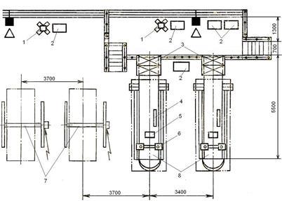 Наиболее распространенными осмотровыми устройствами в зонах ТО и ТР являются канавы и подъемники. В соответствии со СНиП II-93-74 для удобства работы и обеспечения безопасности при наличии двух и более параллельных канав, расположенных рядом, они соединяются между собой открытой траншеей (тупиковые) или тоннелем (проездные). Ширина траншей и тоннелей должна быть не менее 1 м, если они служат только для прохода, и не менее 2 м, если в них расположены рабочие места и технологическое оборудование. Высота тоннеля от пола до низа перекрытия или несущих конструкций для автомобилей над приямками в местах прохода людей принимается не менее 1,8 м. Из тоннелей и траншей предусматриваются выходы по лестницам в производственные помещения: не менее одного на 5 автомобилей. При большем числе автомобилей устраивается дополнительный выход на каждые 10 автомобилей. Ширина выхода должна быть не менее 0,7 м.